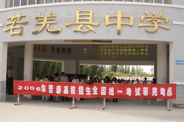 2006-06-07若羌县高考工作顺利进行6月7日是全国高考的第一天,若羌县相关部门积极做好各项工作,确保高考顺利进行。据悉,这次若羌县参加高考的人数有125人,其中汉族考生62人,民族考生63人,今天上午有两名民族考生因病未能参加考试。考试秩序正常,自治区教育局专门下派了一名巡视员监督考场秩序。 图为交警正在考场附近的马路上执勤 考场门口 门口焦急等待的学生家…[详细]
