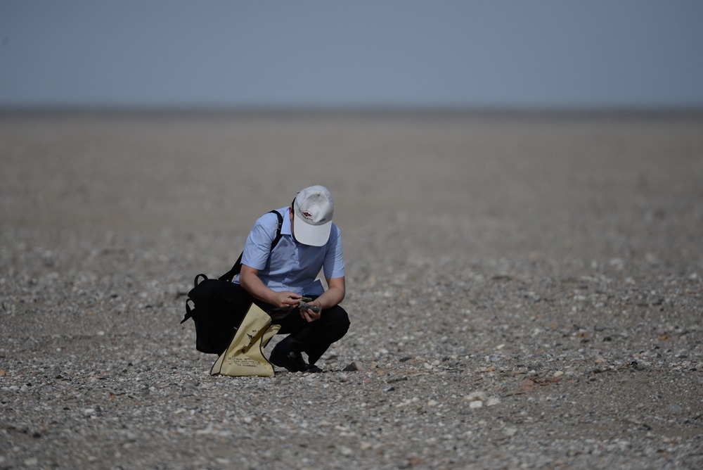 上图为一名游客强光手电筒来鉴别一下刚捡的玉石