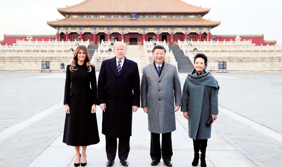 11月8日,国家主席习近平和夫人彭丽媛陪同来华进行国事访问的美国总统特朗普和夫人梅拉尼娅参观故宫博物院。这是两国元首夫妇在太和殿广场合影。(新华社记者 兰红光 摄)