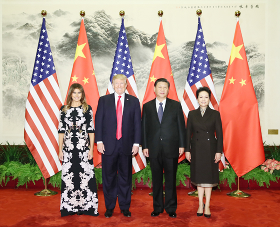 11月9日,国家主席习近平在北京人民大会堂东门外广场举行欢迎仪式,欢迎美利坚合众国总统唐纳德·特朗普对中国进行国事访问。这是习近平和夫人彭丽媛在人民大会堂同特朗普夫妇合影。(新华社记者 兰红光 摄)