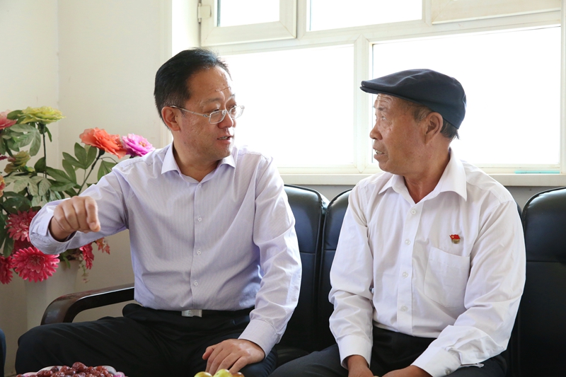 图为 州党委书记李刚与若羌枣农宋礼亲切交谈,了解若羌枣农生活情况