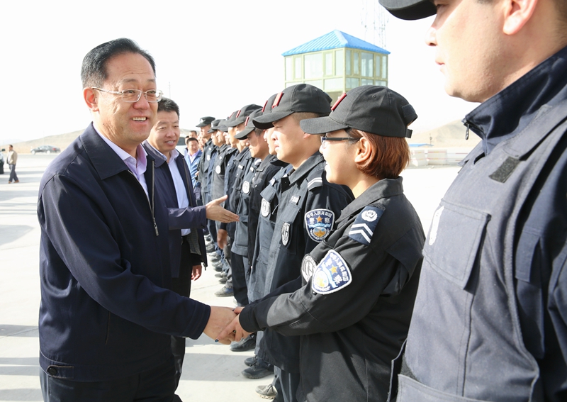 图为 州党委书记李刚与若羌县依吞布拉克镇治安检查站民警一一握手,向他们长期奋战在高海拔、条件艰苦的维稳一线表示感谢