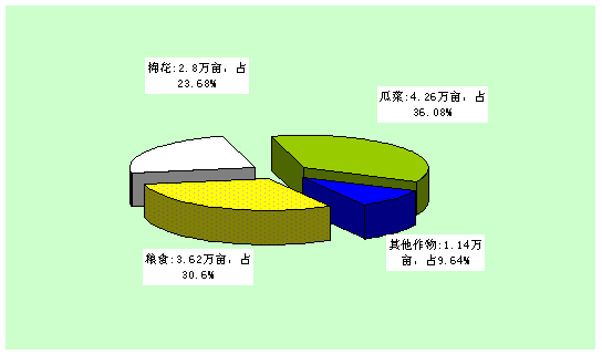 2015年,全县农作物种植面积11.82万亩,比上年减少3.16万亩,下降21.13%,其中:粮食种植面积3.62万亩,比上年减少1.85万亩,下降33.83%;棉花种植面积2.8万亩,比上年减少1.63万亩,下降36.81%;瓜菜种植面积4.26万亩,比上年增加0.1万亩,增长2.59%;其他作物种植面积1.14万亩,比上年增加0.2万亩,增长22.08%。