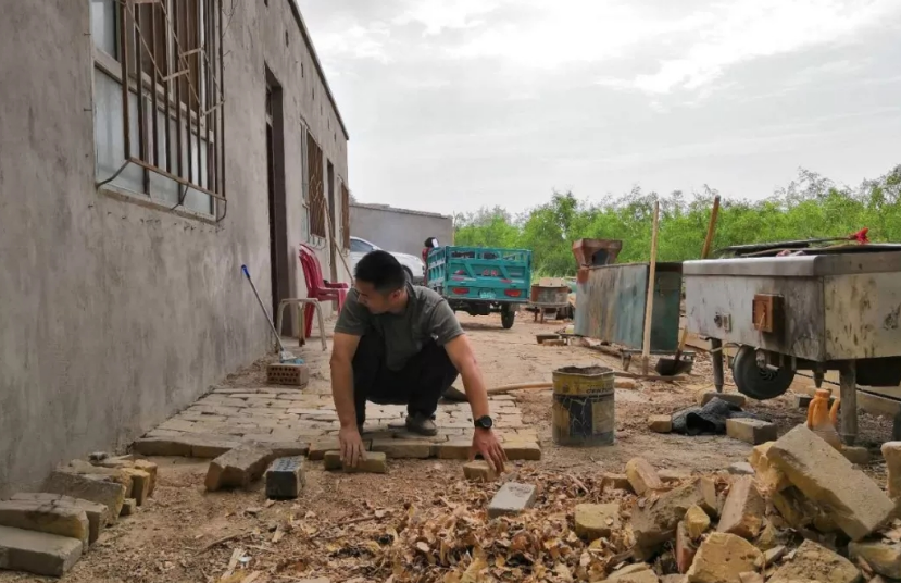 正所谓:帮人帮到底,送佛送到西。看着门前的空地虚土太多,工作队和下沉干部提议为阿里木·霍加布拉营造有个整洁门前环境。看着房屋外墙角落堆积的砖块,下沉干部宋建平建议:“如果夫妻二人同意,我们可以帮忙将砖块铺在门前,这样既干净又能防止刮风尘土飞扬,在架起炉子烤羊肉是很理想的事情。”经过几个小时的忙碌,工作队和下沉干部们很快用砖块把门前铺整齐、炉子也帮着架设好、抓饭炉子也安顿好,力所能及的将所有工作准备就绪。