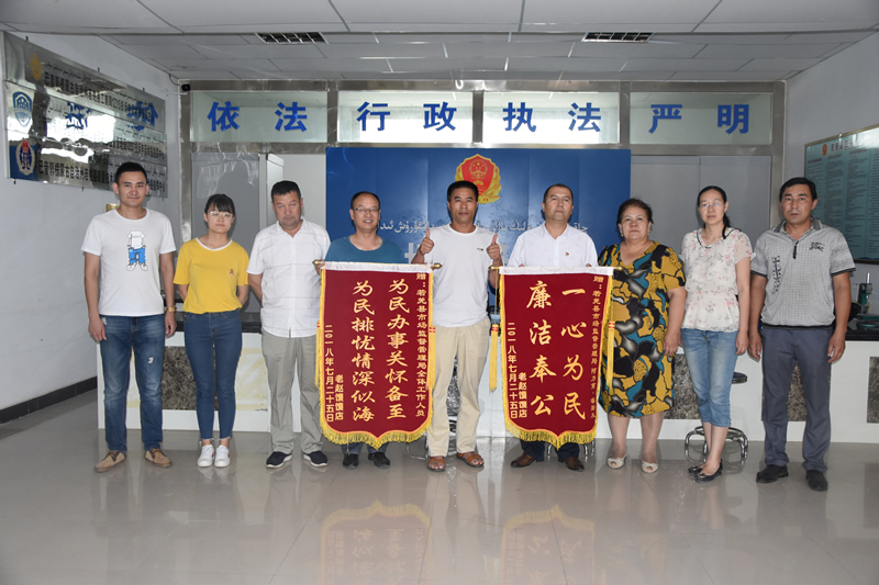 “可找到你了,原来你在这里上班啊!”若羌县楼兰商贸城老赵馍馍店的业主赵祥甫激动地上前握住市场监督管理局党组书记阿力甫·喀斯木的手说道,随即把一面写有“一心为民、廉洁奉公”的锦旗双手郑重地交到阿力甫·喀斯木的手上,“非常感谢您为我们解决了这么大的困难,没有您这位共产党员的出手相助,我们都不知道要靠什么生活啊!谢谢!谢谢!”老赵的喜悦激动之情溢于言表。接着又把一面“为民办事关怀备至、为民排忧情深似海”的锦旗交给阿力甫书记。。。。7月25日上午刚上班,若羌县市场监督管理局一楼大厅里就发生了如此感人的一幕。